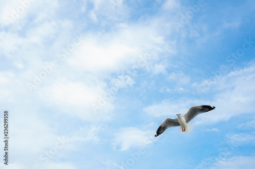 Obraz premium Single seagull flying in a sky as a background at Bangpoo.
