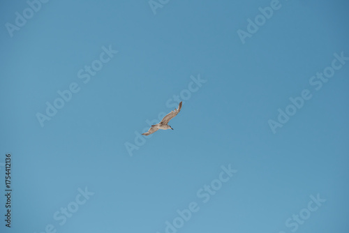Obraz premium Single seagull flying in clear blue sky, minimalistic nature background...