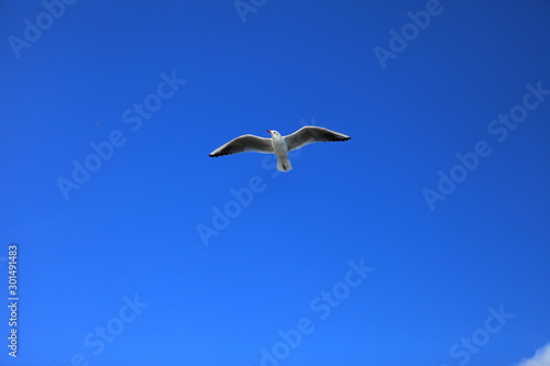 © Lowpower, Obraz premium single seagull spreading its wings flying in the sky during the day time.