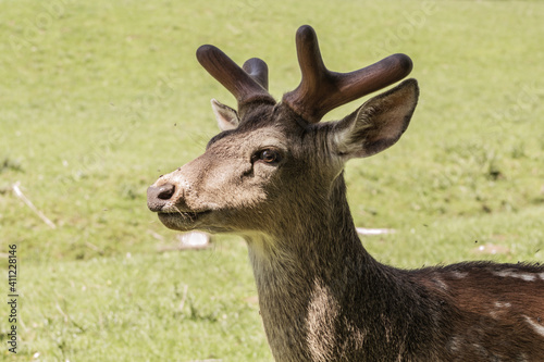 © Joppi, Fototapeta premium Single sika deer on a sunny day. Animal theme. Wildlife park in Warstein, Germany