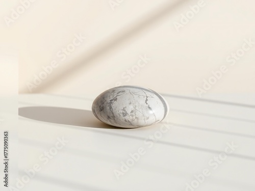 Fototapeta premium Single smooth grey and white speckled stone casting a shadow on a light surface