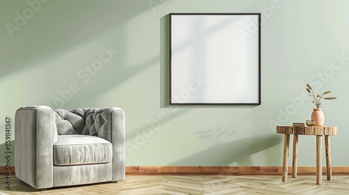 © Hasnain Arts, Fototapeta premium Single square frame on a light green wall in a living room with a light gray velvet armchair and a wooden side table.