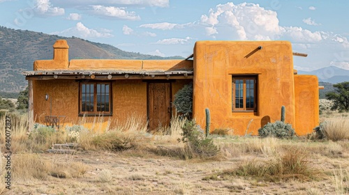 © Антон Сальников, Fototapeta premium Single-story Adobe house with flat roofs and earth-toned exteriors made of sun-dried clay bricks