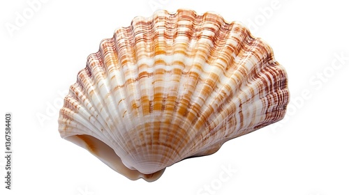 © Apon Stock, Obraz premium Single, striped cockle shell with delicate ridges, displaying natural beauty and elegance on white background.