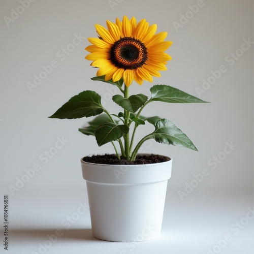 © harryaishi, Obraz premium Single sunflower in white pot.