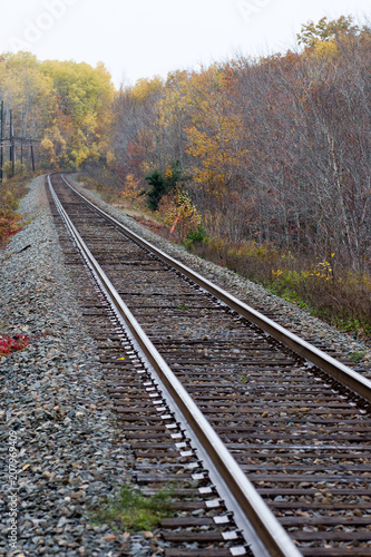 Fototapeta premium Single train tracks in a rural area during the fall season with coloured...