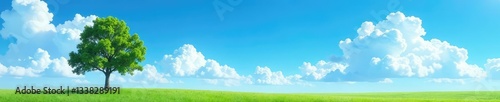 © Thanwara, Obraz premium Single tree against a bright blue sky with fluffy white clouds, nature, clear sky