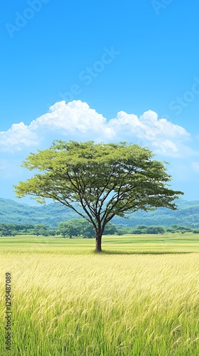 © Quan, Fototapeta premium Single Tree in a Golden Field under a Blue Sky
