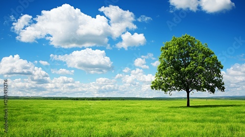 © Uwais, Obraz premium Single Tree in a Verdant Field Under a Bright Blue Sky