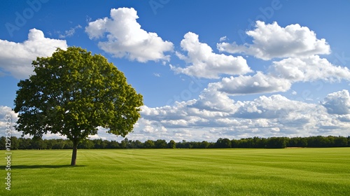 © Gombong, Fototapeta premium Single Tree in a Verdant Field Under a Bright Blue Sky