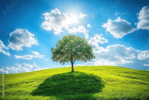 © Olha, Obraz premium single tree in the center. a calm and serene landscape with rolling green hills, a clear blue sky.