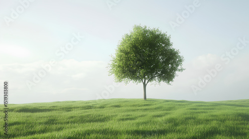 © suldev, Obraz premium Single Tree on a Grassy Plain Under a Pale Sky