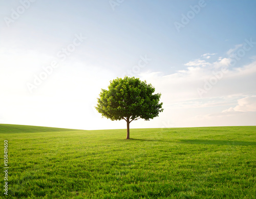 © Nuningkw, Obraz premium Single Tree on a Grassy Plain Under a Pale Sky