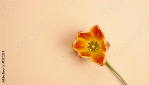 © Steve, Naklejka premium Single tulip flower viewed from above on a beige background with soft lighting.