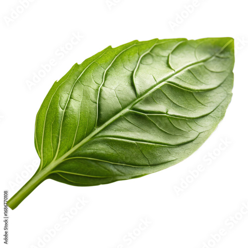 Obraz premium Single vibrant green basil leaf isolated on black background