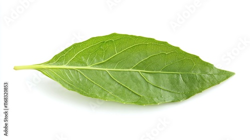 Obraz premium Single vibrant green basil leaf isolated on white background.