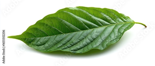 Obraz premium Single vibrant green leaf, isolated on white background. Detailed leaf veins...