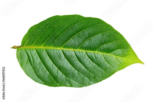 Obraz premium Single, vibrant green leaf isolated on white; ovate shape with prominent,...