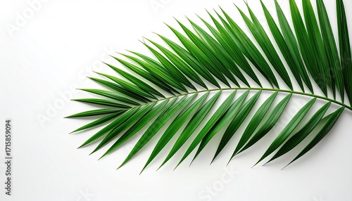 Obraz premium Single vibrant green palm frond, meticulously arranged against a stark white...