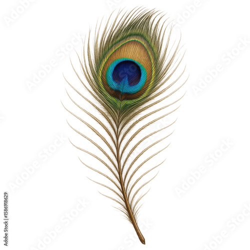 © Katawut, Obraz premium Single vibrant peacock feather showcasing its iridescent blue green gold eye pattern on a transparent background