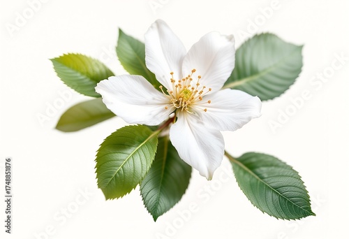 © Faris, Obraz premium Single White Apple Blossom with Green Leaves Isolated.