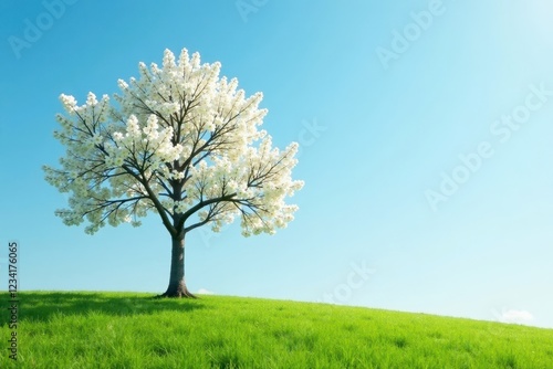Fototapeta premium Single white blossomed tree on a green meadow, grassy area, nature, solitary