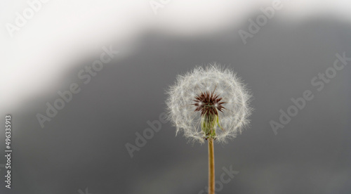 Obraz premium Single white dandelion on gray background