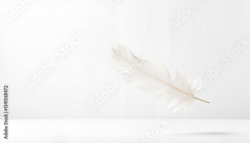 © Andrey, Obraz premium Single white feather falling gently against bright background, peace