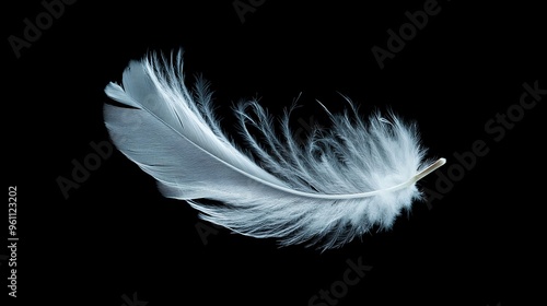 Obraz premium Single white feather floating on a black background.