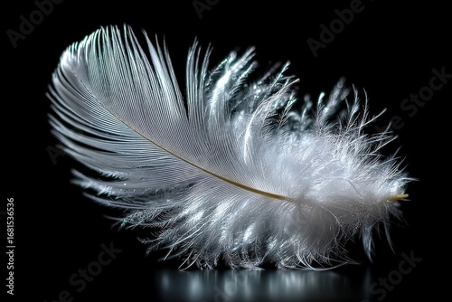 © YouraPechkin, Obraz premium Single white feather on a dark reflective surface