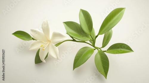 Naklejka premium Single white flower with green leaves on branch.