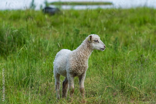 © Magnus, Obraz premium Single white lamb standing in a green pasture