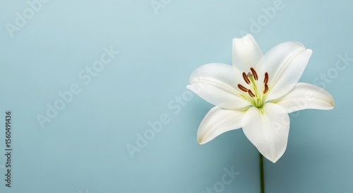 Fototapeta premium Single white lily flower on a light blue background perfect for serenity and peace themed designs