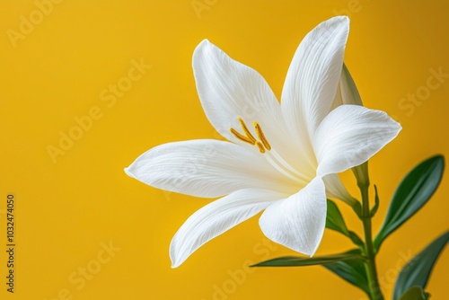 Naklejka premium Single White Lily Flower on a Yellow Background