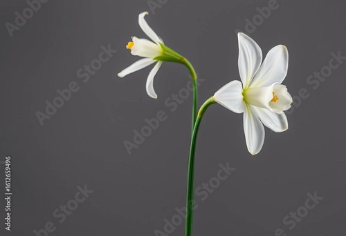 Fototapeta premium Single white narcissus blossom, isolated on grey, macro, plant