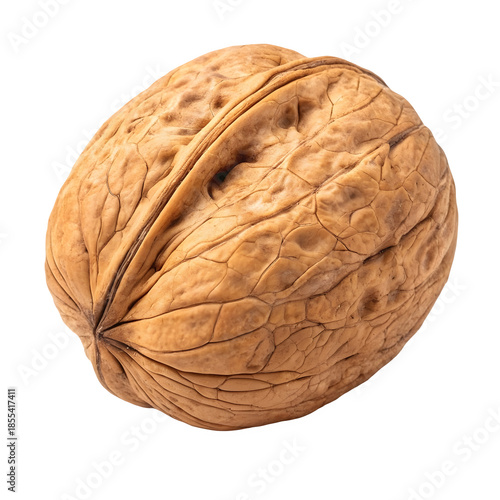Obraz premium Single whole walnut in its textured shell, healthy organic snack and baking ingredient, background removal.