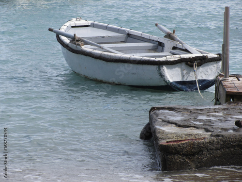 © lukeluke68, Naklejka premium Single wooden rowing boat moored in a harbor on the sea . Tuscany, Italy