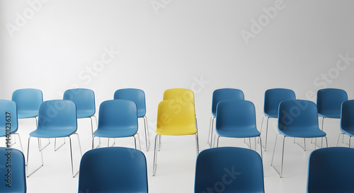 Fototapeta premium Single Yellow Chair Among Blue Chairs in Minimalist Studio