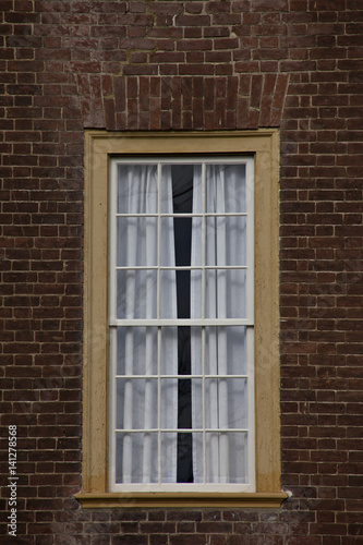 © Heather Reeder, Fototapeta premium Single yellow framed window on red brick wall.
