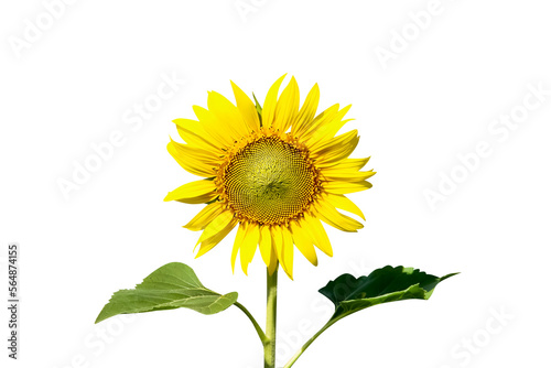© Amphawan, Fototapeta premium Single yellow sunflowers blooming with stem and green leaf isolated on white background,clipping path