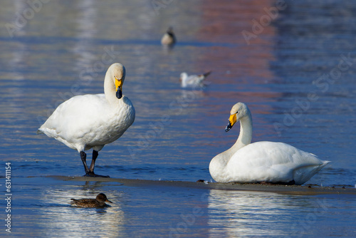 Fototapeta premium Singschwäne auf dem Bodensee kurz vor dem Rückflug in die Heimat, Whooper swans on Lake Constance shortly before returning home