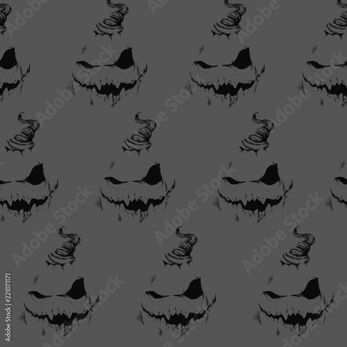 © Ekaterina, Naklejka premium Sinister black smile on a gray background. Seamless pattern. Halloween. shame and a nightmare. pumpkin