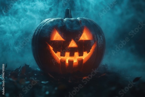Fototapeta premium Sinister Jack-o'-Lantern Illuminated in Fog