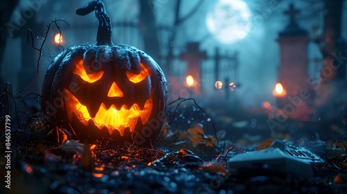© Pixel Alchemist, Fototapeta premium Sinister Jack o Lantern Mask in Foggy Graveyard under Haunting Full Moon