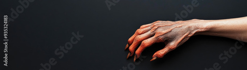 © Rutchaneewan, Fototapeta premium Sinister Transformation, a macabre hand melds human and monstrous traits, showcasing claw-like fingers against a stark background, embodying a haunting metamorphosis.