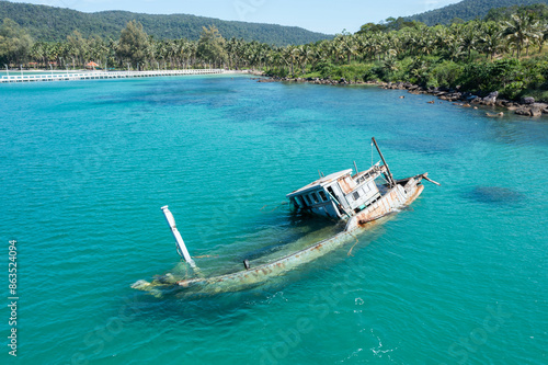 Obraz premium Sinking fishin in shallow water near coast aerial view