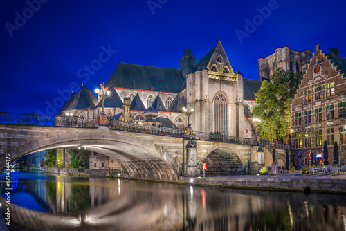 Obraz premium Sint Michielskerk in Ghent during Blue Hour with Night Illumination