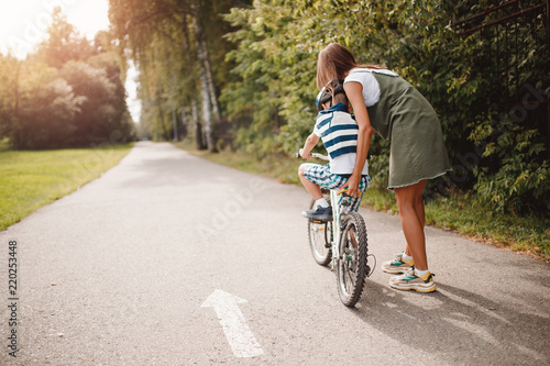 Fototapeta premium Sister and little brother learning to ride bicycle park having fun together