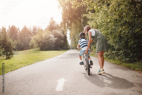 © Parilov, Fototapeta premium Sister and little brother learning to ride bicycle park having fun together