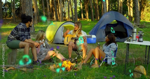 Fototapeta premium Sitting around campfire four friends chatting in forest clearing, with acoustic guitar, tents